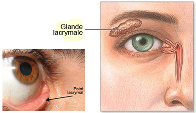 Les larmes sont sécrétées par les glandes lacrymales et sont évacuées vers le nez par les points lacrymaux, deux petits orifices situés sur le bord des paupières supérieure et inférieure près du nez.