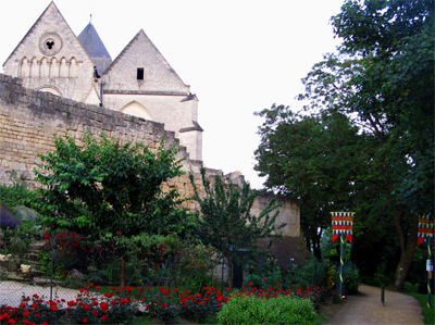 Une oriflamme orne chaque côté du sentier longeant le rempart de la cité fortifiée de Coucy-le-Château (Aisne, France)